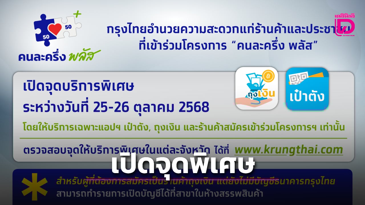 ธนาคารกรุงไทย ประกาศเปิดจุดบริการพิเศษ ในวันเสาร์ที่ 25 ตุลาคม 2568 และวันอาทิตย์ที่ 26 ตุลาคม 2568 เพื่ออำนวยความสะดวกแก่ร้านค้าและประชาชนที่เข้าร่วมโครงการ “คนละครึ่ง พลัส”