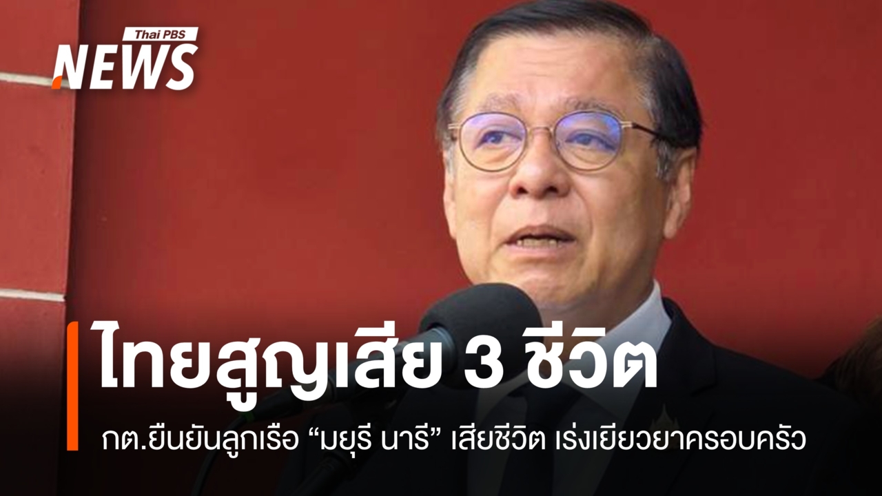 รัฐบาลไทยยืนยัน 3 ลูกเรือ "มยุรี นารี" เสียชีวิตแล้ว หลังเหตุโจมตีในช่องแคบฮอร์มุซ สีหศักดิ์ เตรียมบินด่วนเยือนโอมาน 15 เม.ย. ขอบคุณความช่วยเหลือ และเร่งเจรจาขอเปิดทางให้เรือไทยอีก 9 ลำ ที่ยังติดค้าง ให้เดินทางผ่านพื้นที่ขัดแย้ง ช่วงหยุดยิง 2 สัปดาห์